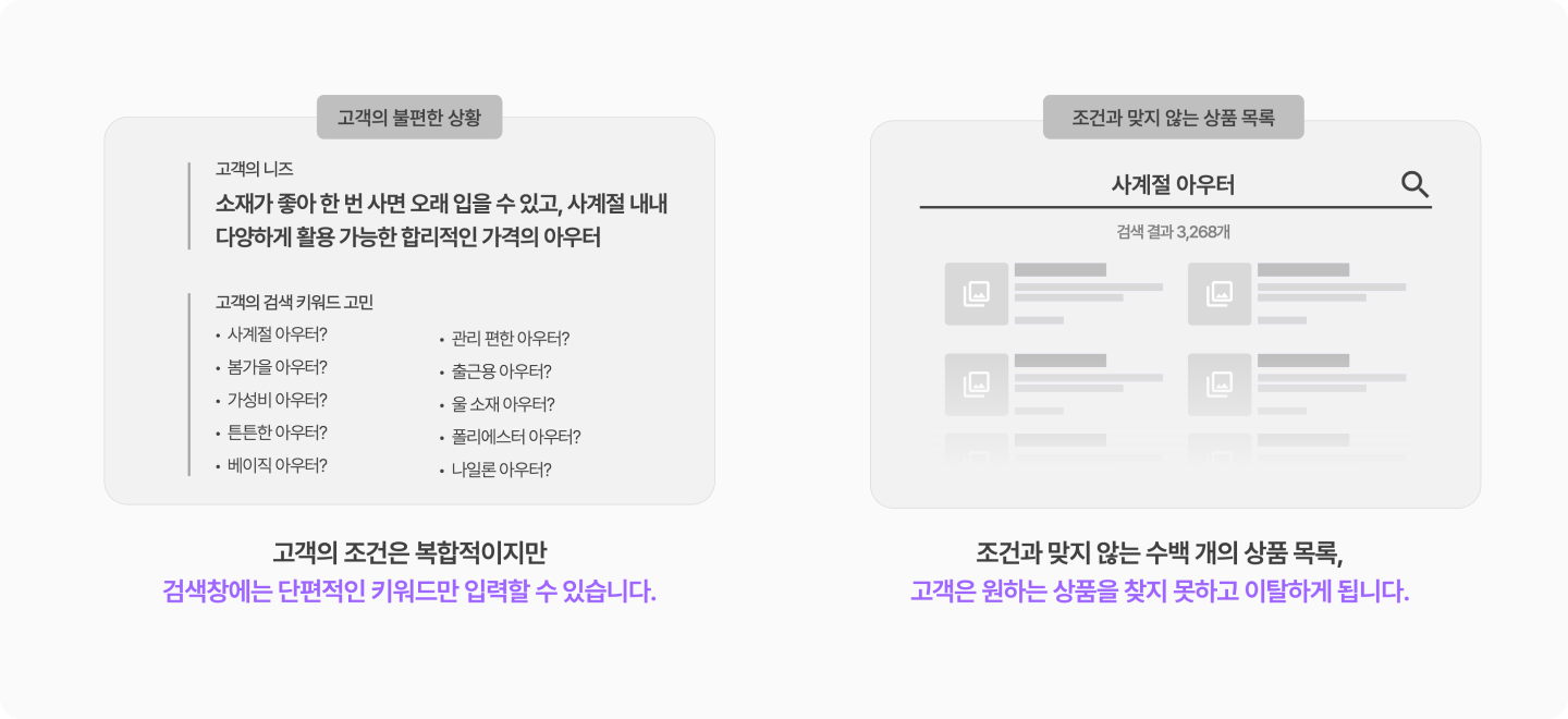 예시: “소재가 좋아서 한 번 사면 오래 입을 수 있고, 사계절 내내 다양하게 활용 가능한 합리적인 가격의 아우터”와 같은 복합적이고 맥락적인 요청을 기존 시스템은 정확하게 이해하고 추천하지 못합니다. 고객의 니즈를 단일 키워드로 압축하지 못하면 고객은 결국 수많은 검색 결과 속에서 길을 잃게 됩니다